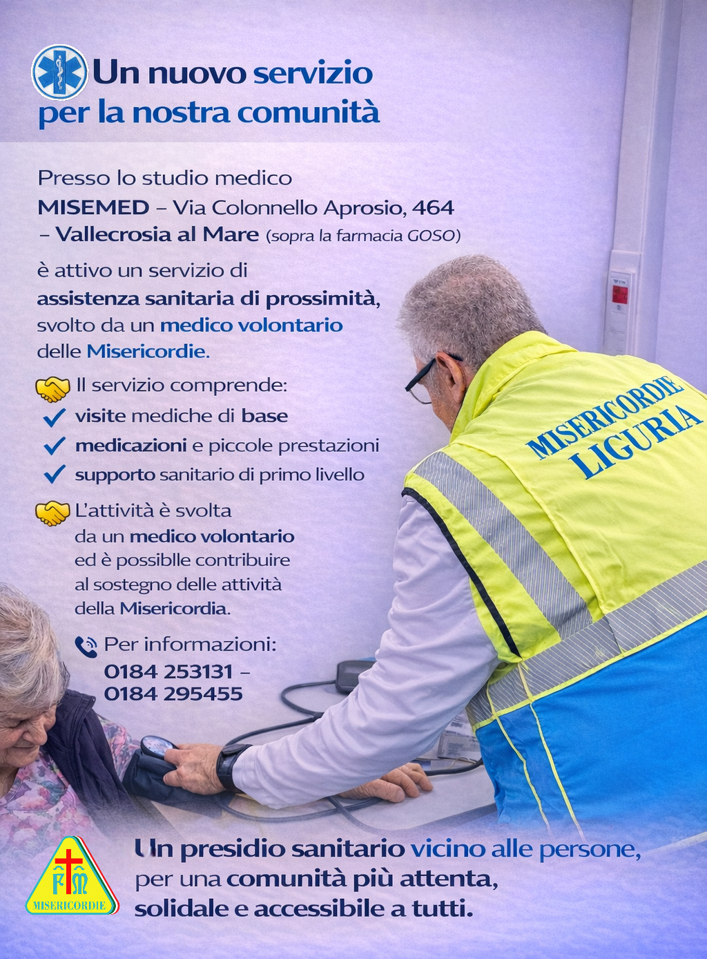 Il servizio vede la presenza del dott. Stefano Ferlito, medico volontario delle Misericordie, già dirigente del Dipartimento di Emergenza della ASL 1 imperiese, oggi in pensione, che mette a disposizione la propria esperienza professionale a favore della comunità.