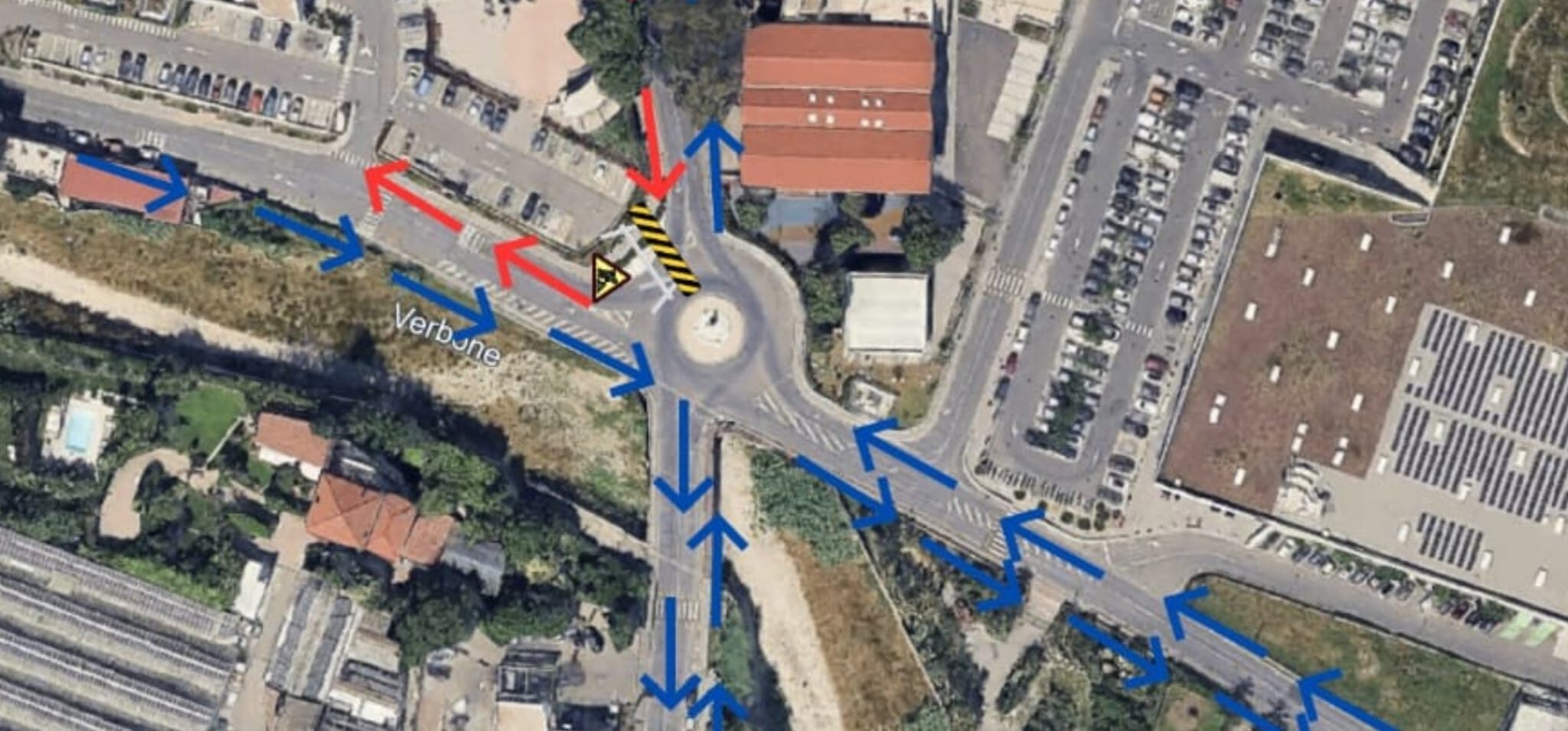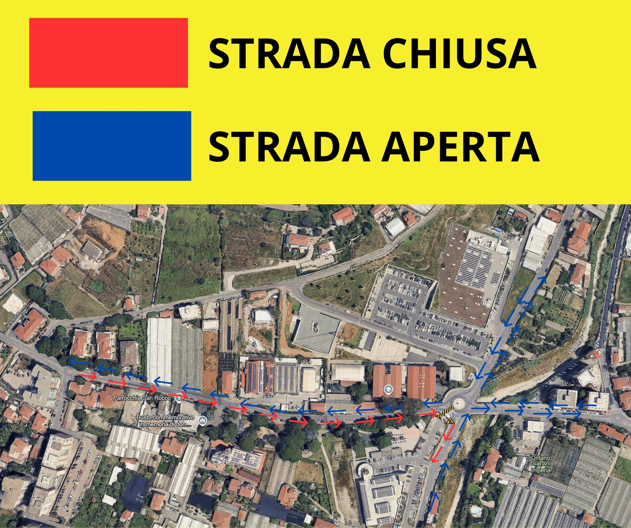 • è imposto l’obbligo, per i veicoli provenienti da via Romana in direzione levante-ponente (da Bordighera a Ventimiglia), di svoltare a destra in via Roma, direzione monte (Vallecrosia Alta, San Biagio, Soldano e Perinaldo), oppure percorrere la rotatoria per immettersi in via San Rocco direzione Ventimiglia. Non sarà possibile scendere verso mare.