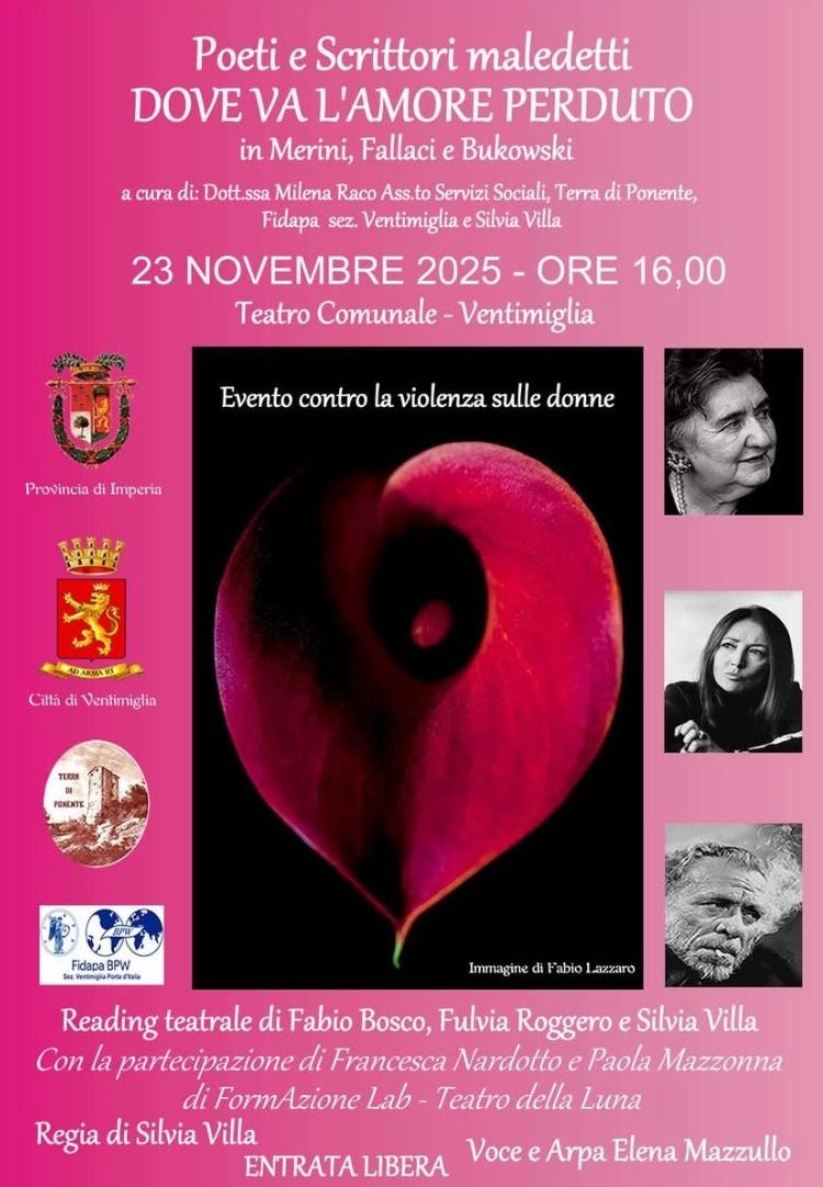 Presso il Teatro Comunale di Ventimiglia domenica 23 novembre ore 16.00, si terrà un Reading Teatrale Letterario dal titolo “Dove va l’Amore perduto in A. Merini, O. Fallaci e C. Bukowski”. Evento voluto dall’Assessora alle politiche d’inclusione Milena Raco e ideato dall’Associazione Terra di Ponente in collaborazione con Fidapa Porta d’Italia sez. Ventimiglia.
