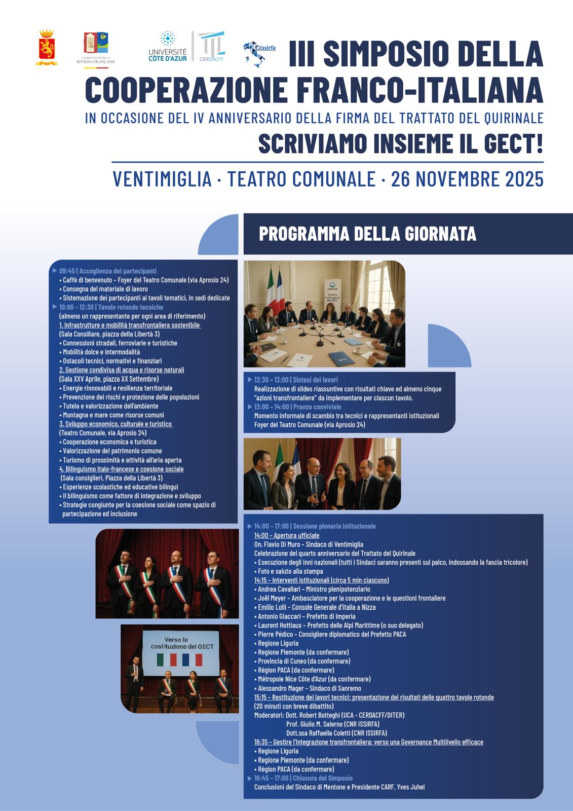 Ventimiglia si prepara a ospitare, per la prima volta in Italia, il terzo “Simposio Transfrontaliero”, in programma il 26 novembre al Teatro Comunale a partire dalle 9.45. L’annuncio è arrivato direttamente da Lione, dove il sindaco Flavio Di Muro ha comunicato la notizia a margine di un incontro istituzionale.